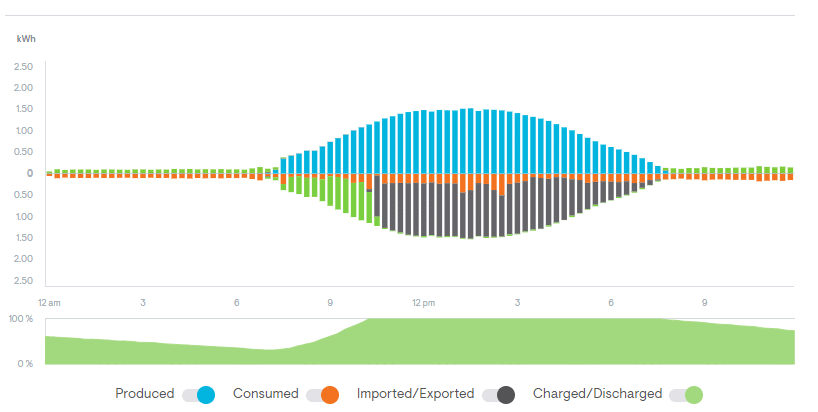 Every day, the batteries charge up in the morning (green) and are sufficient to cover all the night-time consumption.