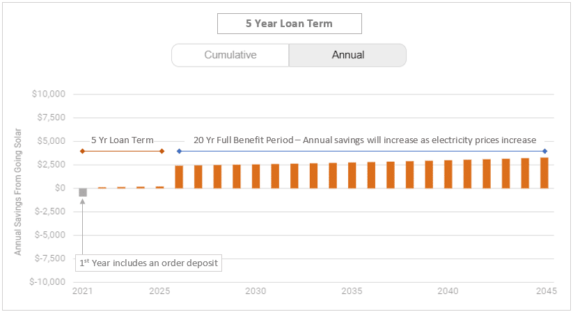 Loan repayment terms of less than 5 years will usually have monthly payments that are higher than the savings generated (but with less overall interest, and achieving full system benefit sooner).