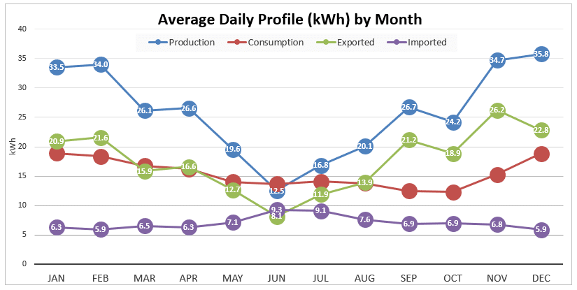 [ Exported ] The green line indicates the average daily energy exported (sold) to the grid, and tends to follow the shape of the blue production line. The exported energy ranges from 9.3kWh/day in June up to 26.2kWh/day in November for this example.