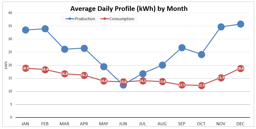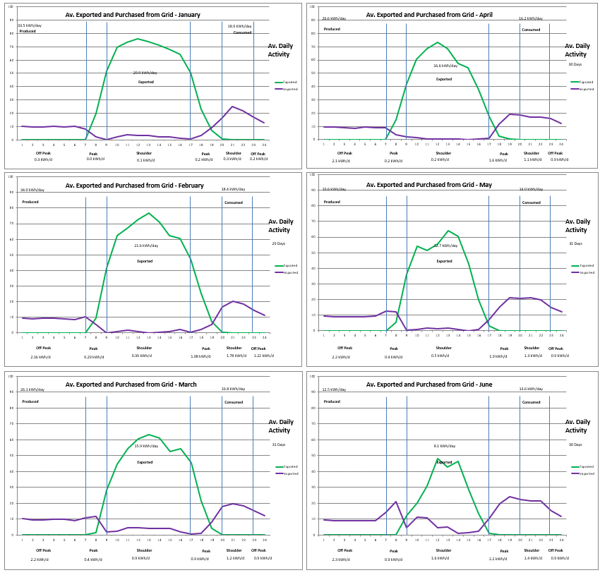 For most households, from month to month the daily patterns remain reasonably constant, with the major variation being the amount exported due to the seasonal effect, especially where gas heating and gas hot water is used.