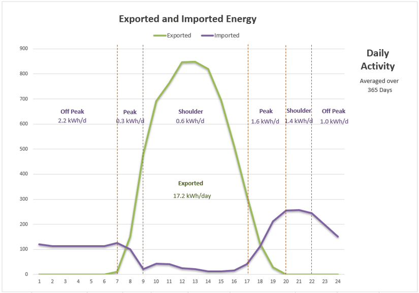 The green line (exported) – average 17.3 kWh/day – indicates when energy export occurs and tends to follow the shape of the production curve. This exported portion of solar power output governs the income earned by the system, the extent of which depends on the Feed-In Tariff (FIT) offered by the energy retailer.