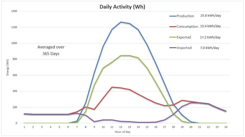 The red line (consumption – average 15.4 kWh/day) shows the times during the day that energy is consumed.