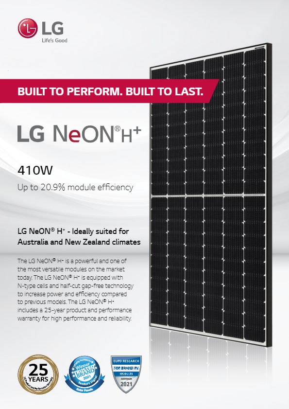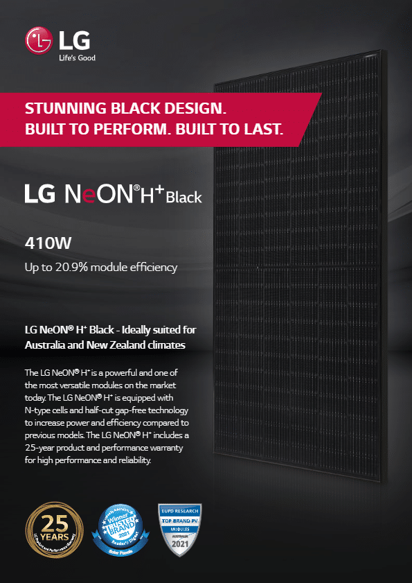 LG NeON H+ and NeON H+ Black are available with 410W power rating from SolarWise Wagga.
