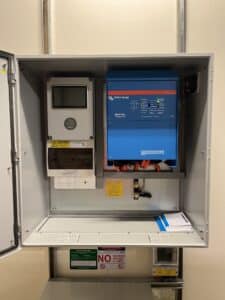 As part of the system we supplied for ROBE we installed a Victron 5kW inverter charger and 3x 4kWh PowerPlus batteries, each with their own cabinets including a cooling system in the inverter cabinet. A monitor was also provided in the inverter cabinet to show battery charge status.