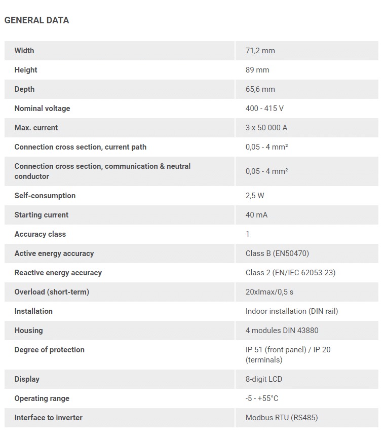 The Fronius Smart Meter is a bidirectional meter which optimises self-consumption and records the household‘s load curve. Thanks to highly accurate measurements and rapid communication via the Modbus RTU interface, dynamic feed-in control when feed-in limits are imposed is faster and more accurate than with the S0. Together with Fronius Solar.web. The Fronius Smart Meter presents a clear overview of power consumption within the home. In the Fronius Energy Package storage solution based on the Fronius Symo Hybrid. The Fronius Smart Meter provides perfectly coordinated management of the various energy flows and optimises overall energy management. It is ideally suited for use with the Fronius Symo, Fronius Symo Hybrid, Fronius Galvo inverters and the Fronius Datamanager 2.0.