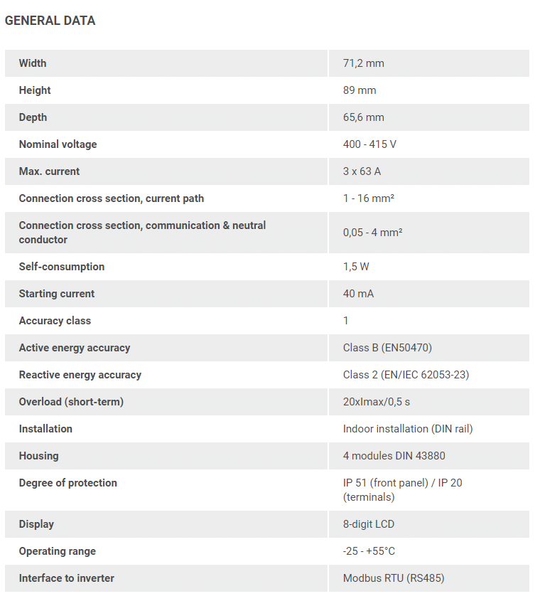 The Fronius Smart Meter is a bidirectional meter which optimises self-consumption and records the household’s load curve. Thanks to highly accurate measurements and rapid communication via the Modbus RTU interface, dynamic feed-in control when feed-in limits are imposed is faster and more accurate than with the S0. Together with Fronius Solar.web. The Fronius Smart Meter presents a clear overview of power consumption within the home. In the Fronius Energy Package storage solution based on the Fronius Symo Hybrid. The Fronius Smart Meter provides perfectly coordinated management of the various energy flows and optimises overall energy management. It is ideally suited for use with the Fronius Symo, Fronius Symo Hybrid, Fronius Galvo inverters and the Fronius Datamanager 2.0.